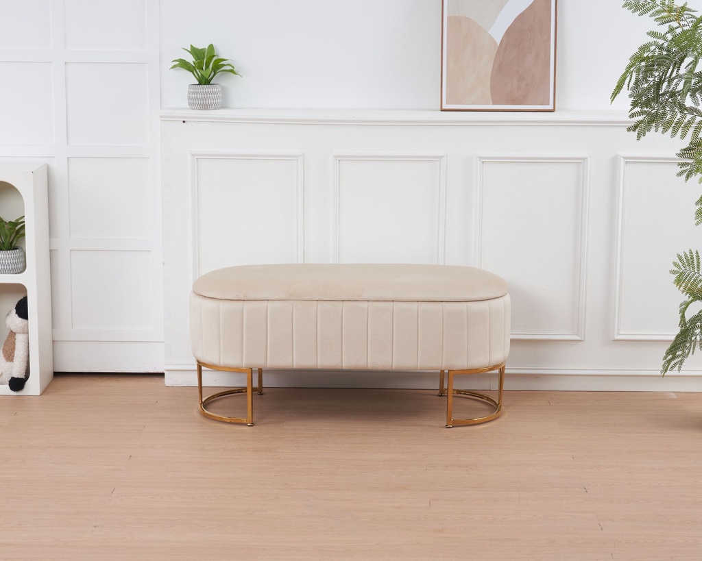 Banc de rangement en velours 1. Cadre : Cadre MDF, recouvert de velours, rempli de mousse neuve. Avec le design de la photo. 2. Siège : panneau de bois, recouvert de velours, rempli d'une nouvelle mousse. L'assise et le cadre sont reliés par des charnières. 3. Taille du produit : L110*D44*H49cm 4. Espace de stockage : 70L
